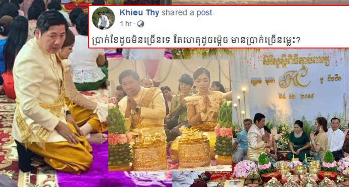 បន្ទាប់ពីបែកធ្លាយថ្លៃបណ្ណាការ ដែលលោកឧត្តមសេនីយ៍ត្រី ស្រេង សុខា ស្នងការរងនគរបាលខេត្តកណ្តាល ជូនខាងស្រី១០ម៉ឺនដុល្លារ ចិញ្ចៀនពេជ្រ២វង់ និងរថយន្តលុចស៊ីស ៥៧០មួយគ្រឿង ដែលមានតម្លៃ២២ម៉ឺនដុល្លារអាមេរិក ក្នុងថ្ងៃភ្ជាប់ពាក្យជាមួយក្មេងស្រីស្រស់ស្អាតនោះ ធ្វើឲ្យអ្នកលេងបណ្តាញសង្គមមួយចំនួនចោទជាសំណួរថា ប្រាក់ខែដូចមិនច្រើនទេ តែហេតុដូចម្តេច មានប្រាក់ច្រើនម្លេះ???