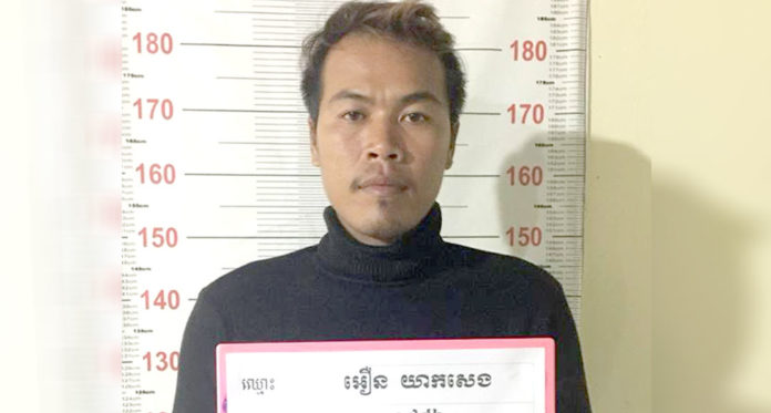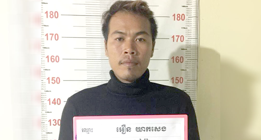 ជនជាប់ចោទ ដែលត្រូវសមត្ថកិច្ចចាប់ឃាត់ខ្លួន មានឈ្មោះអឿន យាកសេង ភេទប្រុស អាយុ៣៣ឆ្នាំ មុខរបរកសិករ មានលំនៅ ក្នុងភូមិព្រៃបាំង ឃុំស៊ីធរ ស្រុកខ្សាច់កណ្តាល។