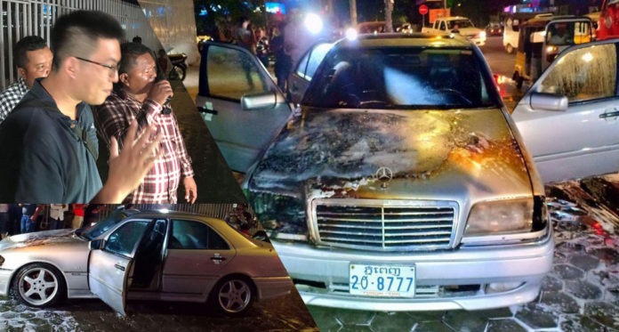 រថយន្តទំនើបដែលទទួលរងការឆាបឆេះទាំងកណ្តាលយប់ ម៉ាក Mercedes ពណ៌ទឹកប្រាក់ ពាក់ស្លាកលេខ ភ្នំពេញ 2O-8777 បើកបរដោយបុរសមិនស្គាល់អត្តសញ្ញាណម្នាក់ គ្រាន់តែដឹងថា ជាជនជាតិចិនតៃវ៉ាន់។