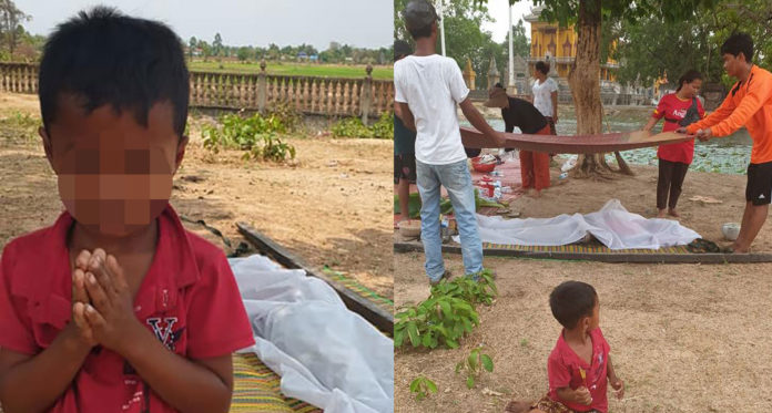 ខេត្តកំពង់ស្ពឺ ៖ ជារឿងដ៏គួរឱ្យសង្វេគបំផុត សម្រាប់ក្រុមគ្រួសារមួយនេះ ដែលបុរសជាឪពុកបានចងកស្លាប់ចោលកូនប្រុសតូច អាយុជាង៣ឆ្នាំ ឱ្យរស់នៅកំព្រែតលតោល ហើយអ្វីដែលកាន់តែធ្វើឱ្យរន្ធត់ចិត្តបំផុតទៀតនោះ គឺដោយសារជីវភាពក្រីក្រ និងគ្មានសាច់ញាតិផង ទើបសពបុរសជាឪពុកត្រូវបានដាក់តម្កល់លើកន្ទេលក្រាលផ្ទាល់នឹងដី និងគ្មានសូម្បីតែរោងបាំងថ្ងៃ បាំងភ្លៀង ហើយគាប់ជួនភ្លៀងបានបង្អុរធ្លាក់ ជាហេតុធ្វើឱ្យកូនតូចរបស់សព បានស្ទុះរត់ទៅអុជធូបរួចអង្គុយបត់ជើង បន់ស្រន់នៅចុងជើងសពឪពុក សុំកុំឱ្យមេឃធ្លាក់ភ្លៀង ដែលបង្កើតបានជាទិដ្ឋភាព គួរឱ្យសោកសង្រេងជាទីបំផុត។ ហេតុការណ៍នេះ បានកើតឡើងនៅចំណុចភូមិចានា ឃុំកណ្តោដុំ ក្រុងច្បារមន ខេត្តកំពង់ស្ពឺ។