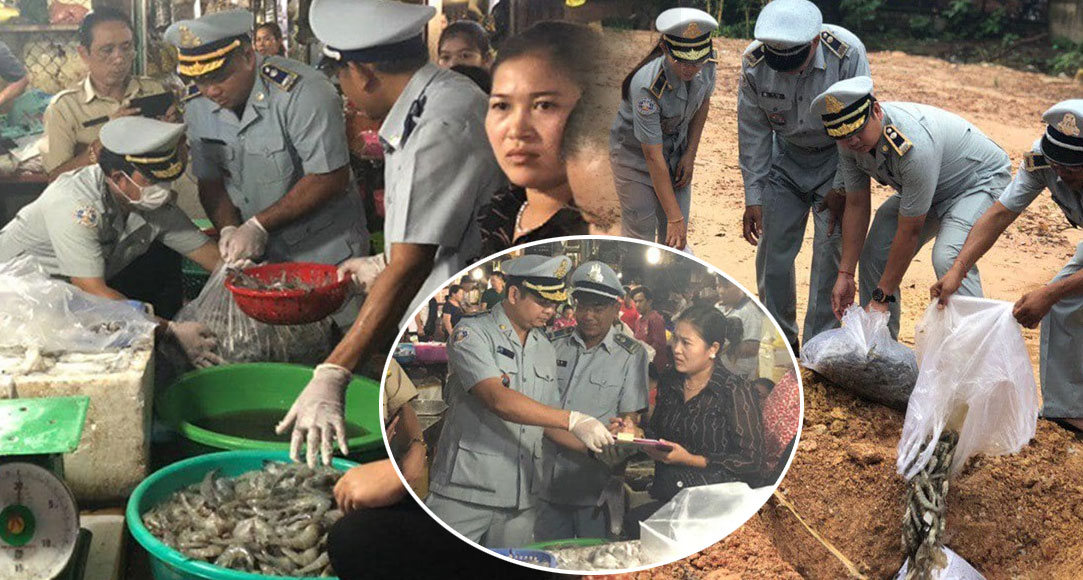 ខេត្តព្រះសីហនុ៖ មន្រ្តីសាខាកាំកុងត្រូលខេត្តព្រះសីហនុ បានសហការជាមួយមន្ត្រីមន្ទីរពាណិជ្ជកម្មខេត្ត គណៈកម្មការផ្សារ និងអាជ្ញាធរដែនដី បានបន្តចុះផ្សព្វផ្សាយអំពីគុណភាព សុវត្ថិភាពម្ហូបអាហារ ត្រួតពិនិត្យផលិតផលម្ហូបអាហារ និងទំនិញវេចខ្ចប់ស្រាប់នៅផ្សារលើ ជាលទ្ធផល បានរកឃើញបង្គាមានចាក់បញ្ចូលសារធាតុចាហួយ ចំនួន៨០គីឡូក្រាម ហើយបានធ្វើកិច្ចសន្យាជាមួយអាជីវករ និងបានយកទៅដុតចោលភ្លាមៗផងដែរ។