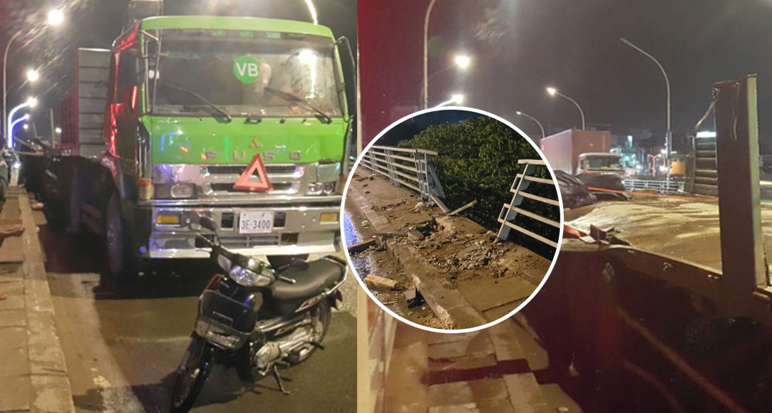 ភ្នំពេញ ៖ រថយន្តសណ្តោងកុងតឺន័រ១គ្រឿង មានដឹកដុំដែកទំងន់រាប់តោន បានបើកឡើងស្ពានព្រះមុនីវង្ស ស្រាប់តែដាច់ខ្សែកាបចំណង ធ្វើឱ្យដុំដែករមៀលទៅខាងឆ្វេងដៃ បណ្តាលឱ្យបាក់ជញ្ជាំងដែករថយន្ត ហើយរមៀលធ្លាក់ទៅបុកបង្កាន់ដៃស្ពានបាក់ធ្លាក់ចុះមកក្រោមស្ពានដល់ដី រងការខូចខាតយ៉ាងដំណំ។
