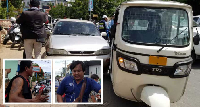 ភ្នំពេញ ៖ រថយន្ត១គ្រឿងបានបើកទៅប៉ះជាមួយនឹងម៉ូតូកង់បី១គ្រឿង បណ្តាលឱ្យរងការខូចខាតតិចតួចដូចគ្នា ស្រាប់តែមិនព្រមដោះស្រាយគ្នាតាមសម្រួលដោយសន្តិវិធី ក៏ប្រឹងតែប្រកែកយកត្រូវរៀងខ្លួន រហូតផ្ទុះជាជម្លោះដេញវាយតប់គ្នាពេញផ្លូវ និងប្រទាញប្រទង់យកទូរស័ព្ទគ្នាទៅវិញទៅមក បង្កឱ្យការភ្ញាក់ផ្អើលដល់សមត្ថកិច្ចមូលដ្ឋាននិងបងប្អូនប្រជាពលរដ្ឋដែលនៅក្បែរទីតាំងកន្លែងកើតហេតុជួយអន្តរាគមន៍។