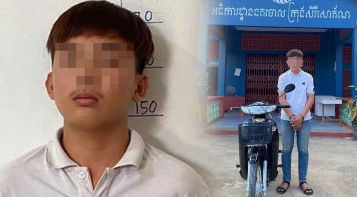 ជនសង្ស័យដែលត្រូវសមត្ថកិច្ចចាប់ឃាត់ខ្លួនរូបនេះ មានឈ្មោះណាប់ សុខា ភេទប្រុស អាយុ១៨ឆ្នាំ មុខរបរមិនពិតប្រាកដ។ ចំណែកម៉ូតូដែលជនសង្ស័យលួចម៉ាកហុងដាឌ្រីមស៊េរីឆ្នាំ២០១៩ ពណ៌ខ្មៅ ពាក់ស្លាកលេខ ប.មានជ័យ 1U-5998 ជាកម្មសិទ្ធិរបស់ឈ្មោះភឿន កេសី ភេទស្រី អាយុ១៥ឆ្នាំ មុខរបរសិស្សវិទ្យាល័យសិរីសោភ័ណ មានលំនៅក្នុងភូមិគោរដ្ឋាន សង្កាត់អូរអំបិល ក្រុងសិរីសោភ័ណ។
