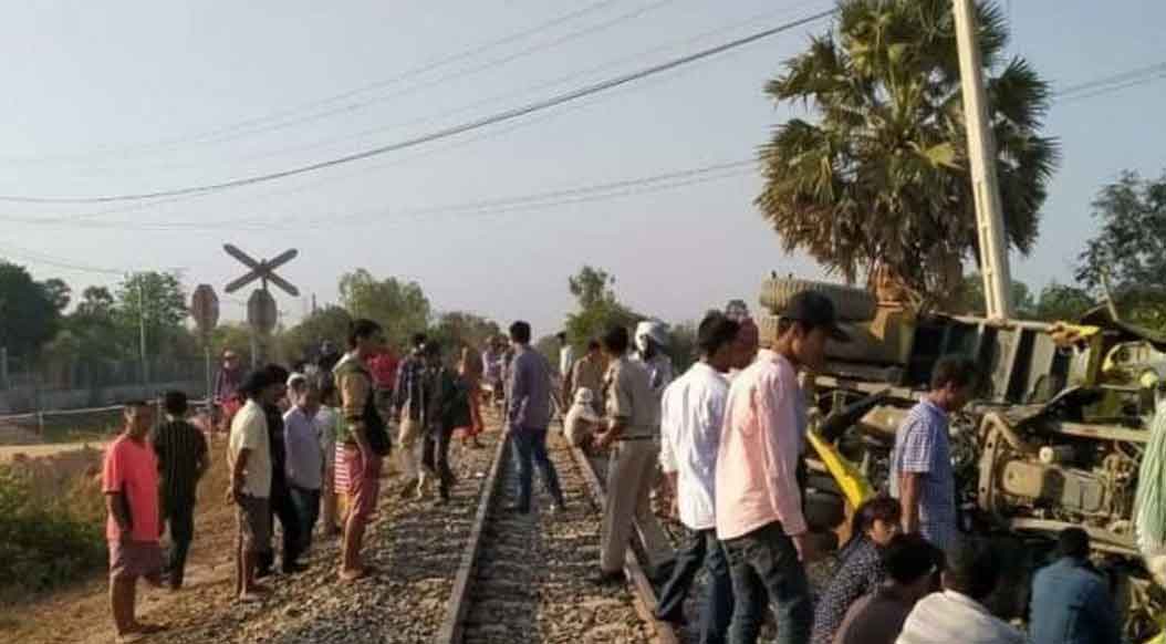 ខេត្តតាកែវ ៖ បុរសជាអ្នកបើកបររថយន្តធុនធំដឹកដីម្នាក់បើកបររថយន្តបណ្តើរ ពាក់កាសត្រចៀកស្តាប់ចម្រៀងបណ្តើរ ឆ្លងកាត់ផ្លូវរថភ្លើង អត់ឮសំឡេងស៊ីផ្លេក៏ត្រូវរថភ្លើងបើកបុកយ៉ាងពេញទំហឹង បណ្តាលឱ្យក្រឡាប់បះជើងធ្វើឱ្យអ្នកបើកបររថយន្តរងរបួសធ្ងន់។