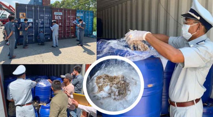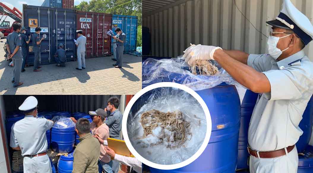 ក្រុងព្រះសីហនុ៖ ពោះវៀនជ្រូកប្រឡាក់អំបិលសម្រាប់ធ្វើសាច់ក្រក នាំចូលពីប្រទេសចិន ចំនួន៦កុងតឺន័រ ដែលបានដឹកមកដល់កំពុងផែស្វយ័តក្រុងព្រះសីហនុ ត្រូវបានមន្ត្រីកាំកុងត្រូលចុះត្រួតពិនិត្យគុណភាព។