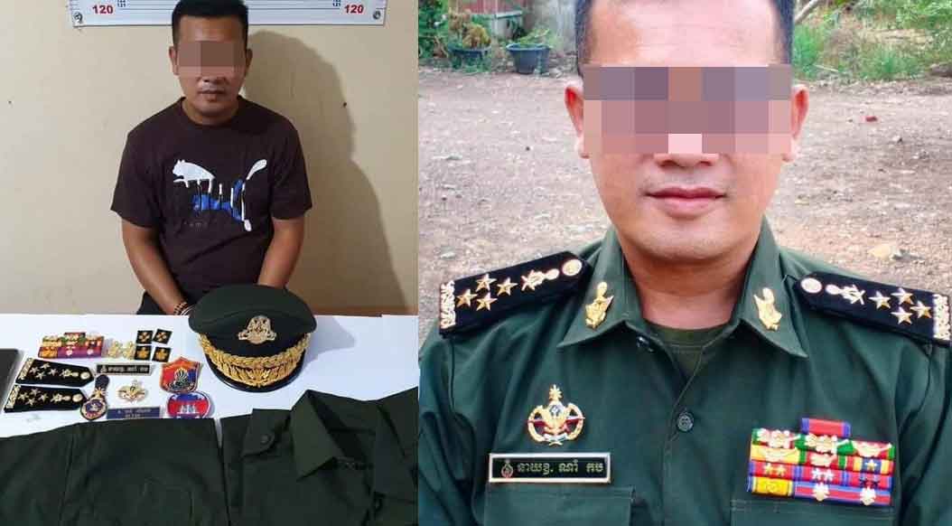 ជនសង្ស័យស្លៀកឯកសណ្ឋានយោធាបន្លំខ្លួនពាក់ផ្កាយ៤ ដែលត្រូវសមត្ថកិច្ចចាប់ឃាត់ខ្លួននេះ មានឈ្មោះណាំ កប ភេទប្រុស អាយុ៣៦ឆ្នាំ មុខរបរមិនពិតប្រាកដ ស្នាក់នៅភូមិវាលទេ ឃុំត្រាង ស្រុកកំរៀង។