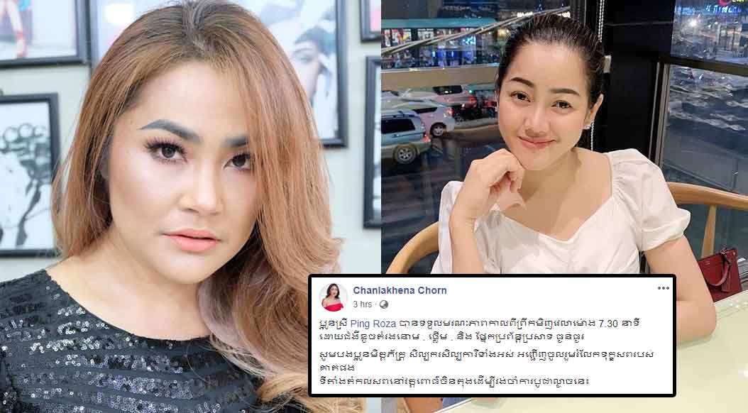 អ្នកនាងចន ច័ន្ទលក្ខិណា បានបង្ហោះសារថា “ប្អូនស្រី Ping Roza បានទទួលមរណៈភាពកាលពីព្រឹកមិញ វេលាម៉ោង7.30 នាទី ដោយជំងឺខូចតំរងនោម ថ្លើម និង ផ្នែកប្រព័ន្ធប្រសាទធ្ងន់ធ្ងរសូមបងប្អូនមិត្តភក្តិ សិល្បករសិល្បការីទាំងអស់ អញ្ជើញចូលរួមរំលែកទុក្ខសពរបស់គាត់ផង