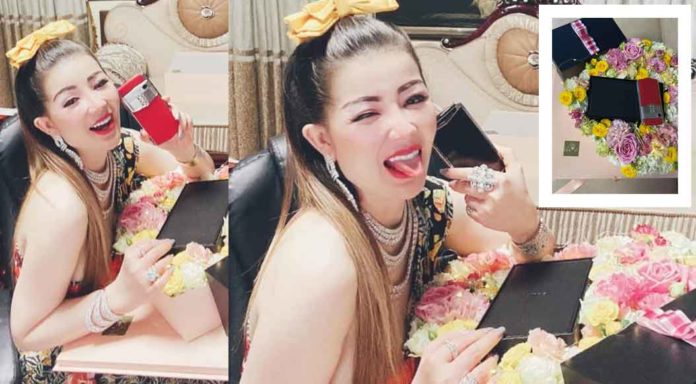 គ្រឿងពេជ្រដែលនាងទើបតែបង្អួតក្ដៅៗ ក្រោយពីធ្វើសកម្មភាពសប្បុរសធម៌ឲ្យម្នាក់ៗសរសើរនោះ គឺចិញ្ចៀនពេជ្រទំហំ11.5លី ColorD ដែលត្រូវបានម្ចាស់ហាងពេជ្របុប្ផាគន្ធ បញ្ជាក់ថា មានតម្លៃជាង៣២ម៉ឺនដុល្លារ កាលពីថ្ងៃទី៨ ខែឧសភា និងកាដូទូរស័ព្ទស៊េរីទំនើប ម៉ាក Vertu ដែលជាប្រភេទទូរស័ព្ទលំដាប់សេដ្ឋីឆ្នាំ២០២០ ដែលមានតម្លៃកប់ពពក។