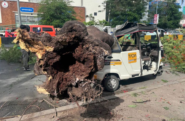 ភ្នំពេញ ៖ ដើមក្ងោក ១ដើម បានបាក់រលំសង្កត់ពីលើកង់បី ១គ្រឿង ហើយមែកដើមក្ងោក ទាក់ដៃចង្កូតម៉ូតូម្តាយកូន ២នាក់ ដួលរងរបួសថែមទៀត។
