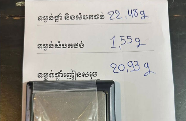 ចំពោះវត្ថុតាងដកហូត រួមមាន ១-ម្សៅក្រាមសថ្លា សង្ស័យសារធាតុញៀន (ម៉ាទឹកកក) ចំនួន៤៥កញ្ចប់ (មធ្យម២ និងតូច៤៣) ទម្ងន់ ២០,៩៣ កាម។ ២-ទូរស័ព្ទដៃ ម៉ាក Samsung ពណ៌ត្រាវ ចំនួន១គ្រឿង។ ៣-អាវុធច្នៃបាញ់គ្រាប់កង់ ចំនួន១ដើម។ ៤-ឧបករណ៍ប្រើប្រាស់និងថង់វេចខ្ចប់គ្រឿងញៀន មួយចំនួន។