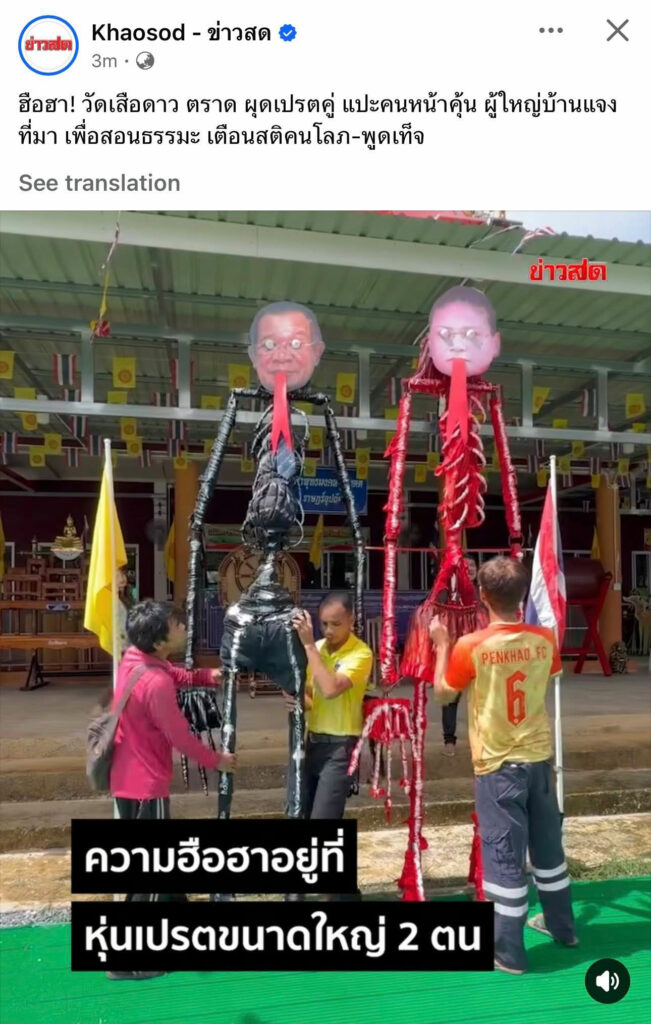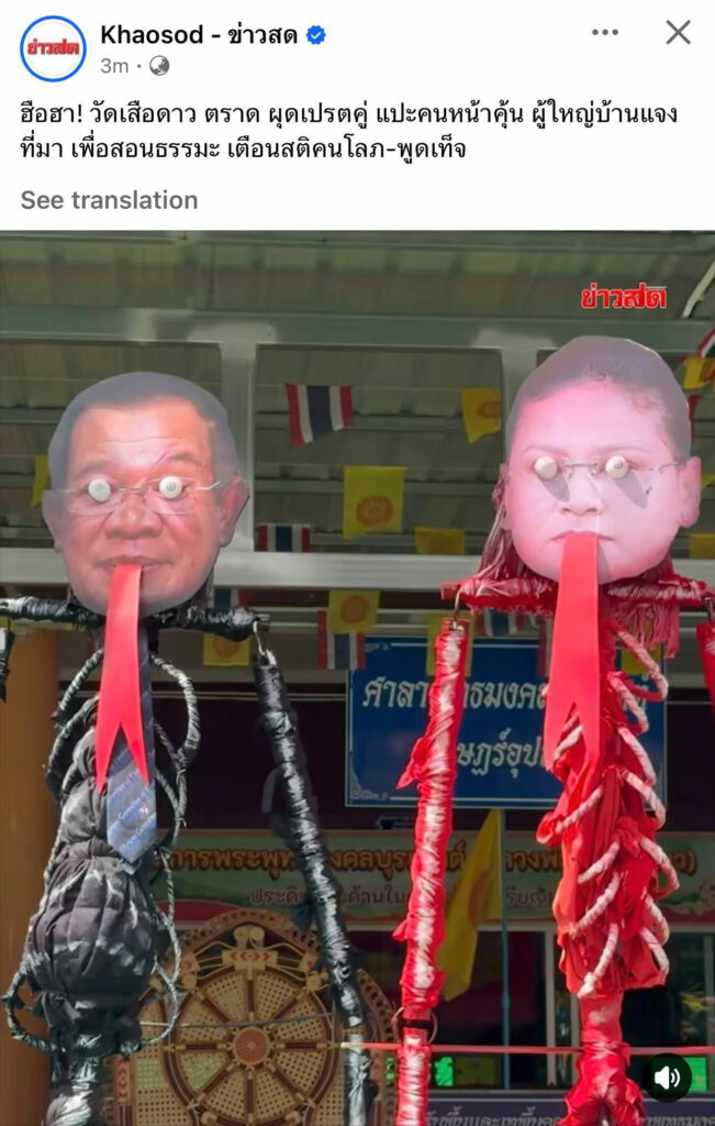 ក្រៅពីយករូបសម្តេចហ៊ុន សែន ទៅធ្វើផ្ទាំងបាញ់ស៊ីបយករង្វាន់ ជនជាតិថៃ ក៏បានយករូបសម្តេចហ៊ុន សែន និងរូបលោកស្រី ម៉ាលី សុជាតា អ្នកនាំពាក្យក្រសួងការពារជាតិកម្ពុជា ធ្វើជារូបទីងមោងប្រេត ដែលជាការប្រមាថបន្ថែមទៀត ហើយត្រូវបានសារព័ត៌មានអនឡាញរបស់ថៃ ឈ្មោះខាវសុត យកមកផ្សាយវាយប្រហារ ប្រមាថថែមទៀត នៅថ្ងៃទី៧ ខែតុលា ឆ្នាំ២០២៥៕