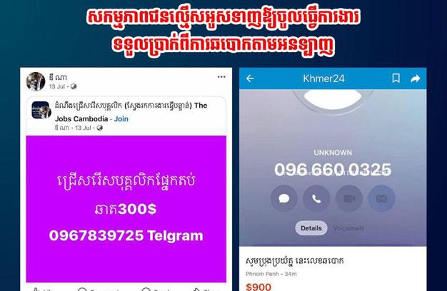 ក្នុងនោះដែរ គណនីហ្វេសប៊ុក របស់ជនអនាមិក នៅតែបន្តបង្ហោះផ្សព្វផ្សាយទិញ-លក់ទូរស័ព្ទ និងស្វែងរកអ្នកចូលរួមធ្វើសកម្មភាពទទួលប្រាក់ និងតបឆាត តាមរយៈលេខទូរស័ព្ទ ០៩៦ ៦៦០ ០៣២៥, ០៩៦ ៧៨៣ ៩៧២៥ និងបានឱ្យ QR Code របស់គណនីធនាគារផ្សេងៗ តាមបណ្តាញសង្គមនានា ក្នុងគោលបំណងជ្រើរើសបុគ្គលិកសម្រាប់ការងារ។