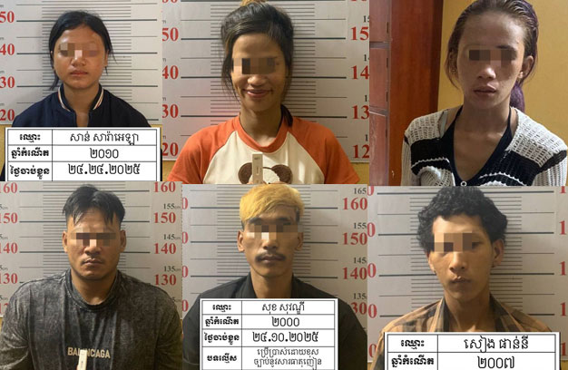 ជនសង្ស័យទាំង៦នាក់ (ស្រី៣នាក់) ដែលត្រូវបានសមត្ថកិច្ចបង្ក្រាបបាន រួមមាន ទី១-ឈ្មោះភ្លី សារុះ ភេទស្រី អាយុ៣០ឆ្នាំ ជនជាតិខ្មែរអ៊ិស្លាម មុខរបរមិនពិតប្រាកដ មានលំនៅ ភូមិបារ៉េនលើ ឃុំស្វាយប្រទាល ស្រុកស្អាង (មានសារធាតុញៀន)។ ទី២-ឈ្មោះសៀង ផាន់នី ភេទប្រុស អាយុ១៨ឆ្នាំ មុខរបរមិនពិតប្រាកដ មានលំនៅ ភូមិក្នុងព្រែក ឃុំព្រែកគយ ស្រុកស្អាង (មានសារធាតុញៀន)។ ទី៣-ឈ្មោះលី បូឡា ភេទប្រុស អាយុ៣៧ឆ្នាំ មុខរបរមិនពិតប្រាកដ មានលំនៅភូមិព្រៃសាលា ឃុំព្រៃសាលា ស្រុកកំពង់ត្រឡាច ខេត្តកំពង់ឆ្នាំង (មានសារ ធាតុ ញៀន)។ ទី៤-ឈ្មោះសុខ សុវណ្ឌី ភេទប្រុស អាយុ២៤ឆ្នាំ មុខរបរមិនពិតប្រាកដ មានលំនៅ ភូមិលេខ២ សង្កាត់ស្វាយរលំ ក្រុងតាខ្មៅ (មាន សារធាតុញៀន)។ ទី៥-ឈ្មោះចន ស្រីខួច ភេទស្រី អាយុ២១ឆ្នាំ មុខរបរមិនពិតប្រាកដ មានលំនៅ ភូមិព្រែករុនក្រោម ឃុំព្រែកគយ ស្រុកស្អាង (មានសារធាតុញៀន) និងទី៦-ឈ្មោះសាន់ សារ៉ាអេឡា ភេទស្រី អាយុ១៥ឆ្នាំ មុខរបរមិនពិតប្រាកដ មានលំនៅ ភូមិព្រែករុនក្រោម ឃុំព្រែកគយ ស្រុកស្អាង (មានសារធាតុញៀន)។