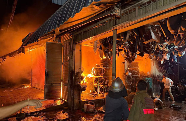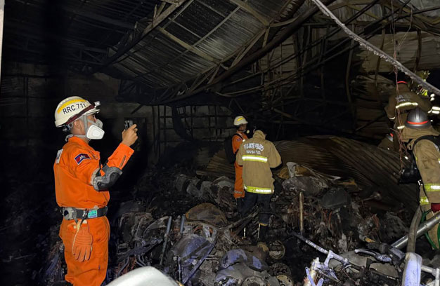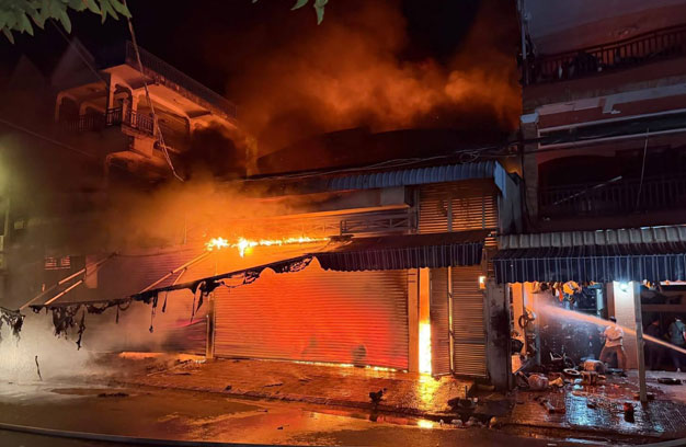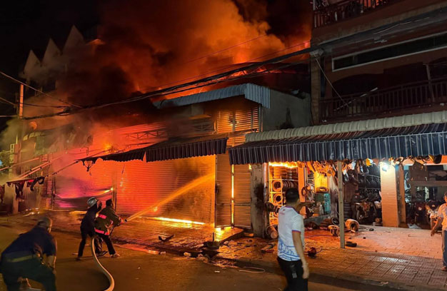 ភ្នំពេញ ៖ ឃ្លាំងស្តុកនិងលក់ម៉ូតូជប៉ុន ធុនធំ ១កន្លែង មានស្តុកទុកម៉ូតូ រាប់រយគ្រឿង ត្រូវបានអគ្គិភ័យឆាបឆេះយ៉ាងសន្ធោសន្ធៅ ផ្អើលពលរដ្ឋនិងសមត្ថកិច្ចជំនាញ ចេញរថយន្តពន្លត់អគ្គិភ័យអន្តរាគមន៍បាញ់ទឹកពន្លត់ អស់ប្រមាណជាង១០០ឡាន ទើបអាចគ្រប់គ្រងស្ថានការណ៍បាន។ ប៉ុន្តែម៉ូតូជាច្រើគ្រឿង និងគ្រឿងបន្លាស់មួយចំនួន ត្រូវបានភ្លើងឆេះខូចខាត ដោយអូសជញ្ជូនចេញមិនទាន់។
