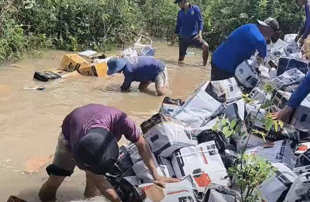 រថយន្តដឹកទំនិញនេះ គ្មានស្លាកលេខ បានក្រឡាប់បណ្តាលឱ្យទំនិញជាប្រភេទគ្រឿងអេឡិចត្រូនិក នាំចូលពីប្រទេសវៀតណាម បានធ្លាក់ចូលប្រឡាយទឹក។