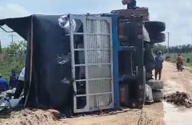 ខេត្តស្វាយរៀង ៖ រថយន្តធុនធំ ១គ្រឿង កំពុងបើកបរនៅលើផ្លូវខ្នងទំនប់ប្រឡាយ ស្រាប់តែក្រឡាប់ផ្ងាជើង ចាក់ចោលទំនិញចេញមកសុទ្ធតែជាគ្រឿងអេឡិចត្រូនិកវៀតណាម។