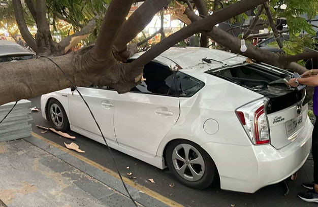 រថយន្តដែលត្រូវដើមក្ងោកបាក់សង្កត់ បណ្តាលឱ្យរងការខូចខាត ម៉ាកតូយ៉ូតា ព្រូស ពណ៌ស ពាក់ស្លាកលេខ ភ្នំពេញ 2BY-4458។