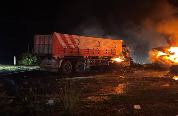 ខេត្តស្វាយរៀង ៖ រថយន្តដឹកដី ១គ្រឿង បើកបរក្នុងល្បឿនលឿន ដោយខ្វះការប្រុងប្រយ័ត្ន ជ្រុលទៅបុកពីក្រោយរថយន្តដឹកស៊ីទែនប្រេងឥន្ធនៈ ពេញទំហឹង បណ្តាលឱ្យផ្ទុះឆេះរថយន្តដឹកប្រេង រហូតសល់តែគ្រោងឆ្អឹង។