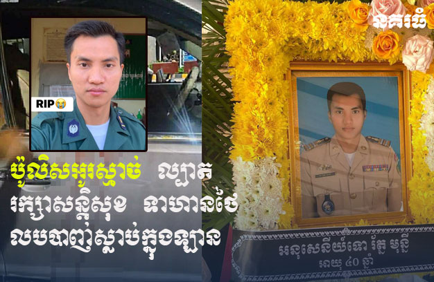 ខេត្តឧត្តរមានជ័យ ៖ វីរនគរបាល មួយរូប កំពុងចេញល្បាត រក្សាសន្តិសុខតាមលំនៅឋានប្រជាពលរដ្ឋក្នុងមូលដ្ឋានសង្កាត់អូរស្មាច់ ក្រុងសំរោង ខេត្តឧត្តរមានជ័យ ស្រាប់តែត្រូវទាហានថៃឈ្លានពាន បានលបបាញ់ ប្រហារចូលក្នុងរថយន្ត បណ្តាលឱ្យរងរបួសយ៉ាងធ្ងន់ និងបានបាត់បង់ជីវិត ក្រោយពីបញ្ជូនមកសង្គ្រោះនៅមន្ទីរពេទ្យ។