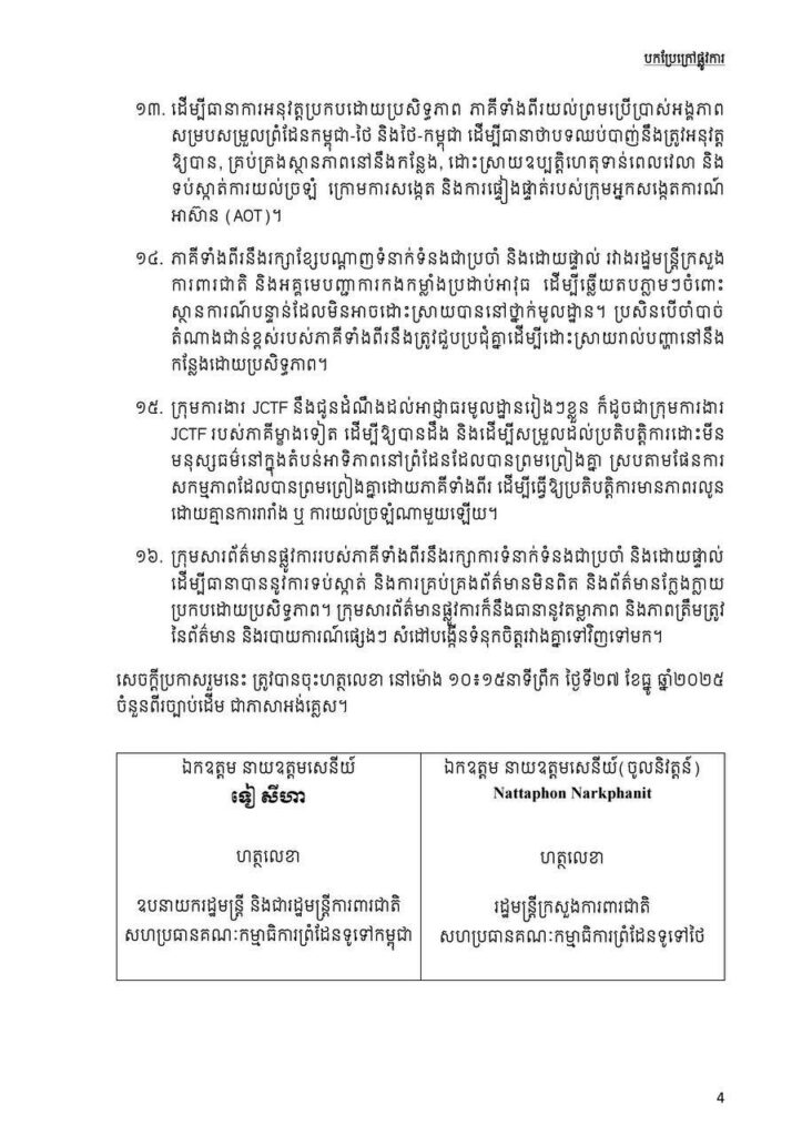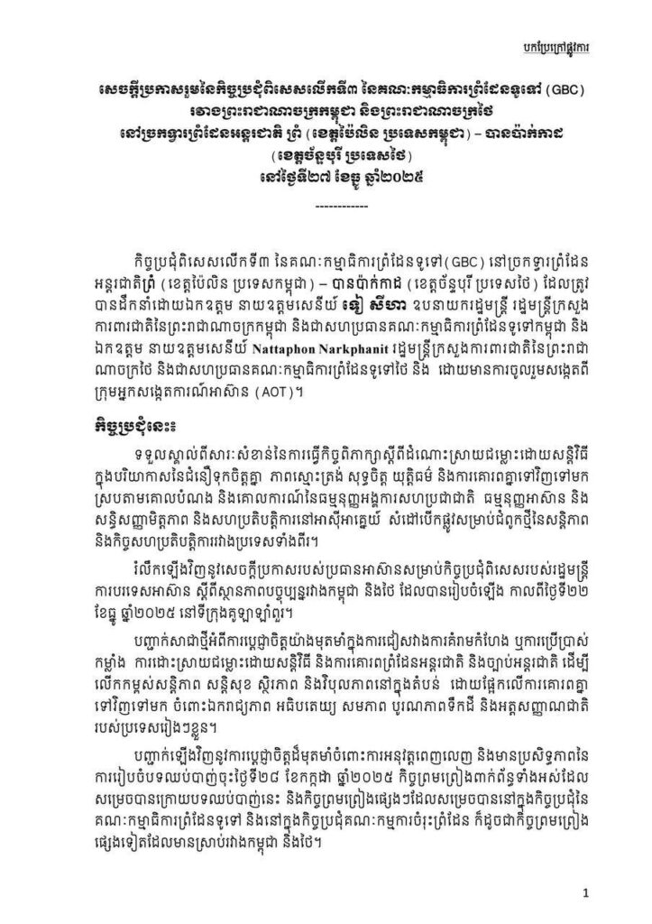 កិច្ចប្រជុំពិសេស GBC កម្ពុជា-ថៃ ឯកភាពលក្ខខណ្ឌ១៦ អនុវត្តបទឈប់បាញ់ ចាប់ពីម៉ោង១២ថ្ងៃត្រង់ ថ្ងៃ២៧ ធ្នូ ២០២៥