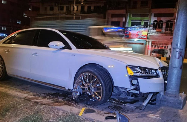 ភ្នំពេញ ៖ បុរសម្នាក់បើករថយន្តទំនើប ១គ្រឿង ក្នុងល្បឿនលឿន រួចរេចង្កូតឡើងខឿនផ្លូវ ហើយបន្តទៅបុកបង្គោលភ្លើងបំភ្លឺផ្លូវ ១ដើម បណ្តាលឱ្យខូចខាត ខណៈរថយន្តខូចខាតយ៉ាងដំណំ តែសំណាងល្អ មិនបង្កឱ្យមានគ្រោះថ្នាក់ដល់មនុស្សឡើយ។