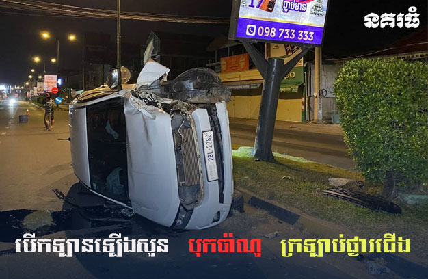 ភ្នំពេញ ៖ បុរសម្នាក់ បានបើករថយន្ត ១គ្រឿង ក្នុងល្បឿនលឿន មិនប្រយ័ត្ន រេចង្កូតឡើងសួនផ្លូវ រួចបន្តទៅបុកបង្គោលប៉ាណូផ្សាយពាណិជ្ជកម្ម បាក់ទ្រេត ១ដើម ចំណែករថយន្ត ក្រឡាប់ផ្ងារជើង ខូចខាតធ្ងន់។