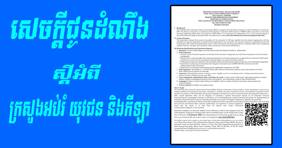 Homeព័ត៌មានជាតិសេចក្តីជូនដំណឹង ស្តីអំពី ក្រសួងអប់រំ យុវជន និងកីឡា ព័ត៌មានជាតិ សេចក្តីជូនដំណឹង ស្តីអំពី ក្រសួងអប់រំ យុវជន និងកីឡា By Davin January 16, 2026 0 0 Share FacebookTwitterPinterestWhatsApp RELATED ARTICLES ព័ត៌មានជាតិ សេចក្តីជូនដំណឹង ស្តីអំពី ក្រសួងអប់រំ យុវជន និងកីឡា January 16, 2026 ព័ត៌មានជាតិ រដ្ឋបាលរាជធានីភ្នំពេញ គ្រោងដាក់ឱ្យពលរដ្ឋទទួលសេវាច្រកចេញចូលតែមួយ តាមអនឡាញ January 16, 2026 ព័ត៌មានជាតិ ធាតុអាកាសតំបន់ជួរភ្នំកម្ពុជា បន្តចុះត្រជាក់ដល់ថ្ងៃ១៧មករា January 16, 2026