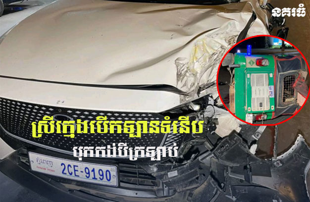 ភ្នំពេញ ៖ នារីម្នាក់ បើករថយន្តទំនើប ១គ្រឿង ក្នុងល្បឿនលឿន មិនប្រយ័ត្ន ជ្រុលបុកម៉ូតូកង់បី ១គ្រឿង កំពុងបើកឆ្លងផ្លូវ ពេញទំហឹង បណ្តាលឱ្យប៉ើងម៉ូតូកង់បី ក្រឡាប់ផ្ងារជើង និងបណ្តាលឱ្យបុរសជាម្ចាស់កង់បី រងរបួសធ្ងន់ ត្រូវបានដឹកបញ្ជូនទៅកាន់មន្ទីរពេទ្យភ្លាមៗ។