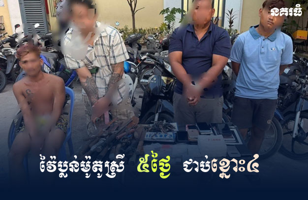 ភ្នំពេញ ៖ ជនសង្ស័យ ១ក្រុម បានធ្វើសកម្មភាពវាយប្លន់ម៉ូតូ ១គ្រឿង ពីស្ត្រីម្នាក់ បានសម្រេច លុះ ៥ថ្ងៃក្រោយមក ត្រូវបានកម្លាំងសមត្ថកិច្ចជំនាញ ស្រាវជ្រាវឃាត់ខ្លួនបាន សរុបចំនួន៤នាក់ នាំយកមកចាត់ការតាមច្បាប់។