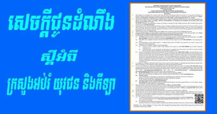 Homeព័ត៌មានជាតិសេចក្តីជូនដំណឹង ស្តីអំពី ក្រសួងអប់រំ យុវជន និងកីឡា ព័ត៌មានជាតិព្រឹត្តិការណ៍សង្គម សេចក្តីជូនដំណឹង ស្តីអំពី ក្រសួងអប់រំ យុវជន និងកីឡា By Davin March 27, 2026 0 0 Share FacebookTwitterPinterestWhatsApp RELATED ARTICLES ព័ត៌មានជាតិ វប្បធម៌ដកដាំឡើងធំ កំណែទម្រង់រដ្ឋបាល-អភិបាលកិច្ច មិនជោគជ័យ April 3, 2026 ព័ត៌មានជាតិ វប្បធម៌ដកដាំឡើងធំ កំណែទម្រង់រដ្ឋបាល-អភិបាលកិច្ច មិនជោគជ័យ April 3, 2026 ព័ត៌មានជាតិ ក្រសួងធម្មការ ណែនាំរៀបចំពិធីបុណ្យចូលឆ្នាំថ្មីប្រពៃណីជាតិ April 1, 2026