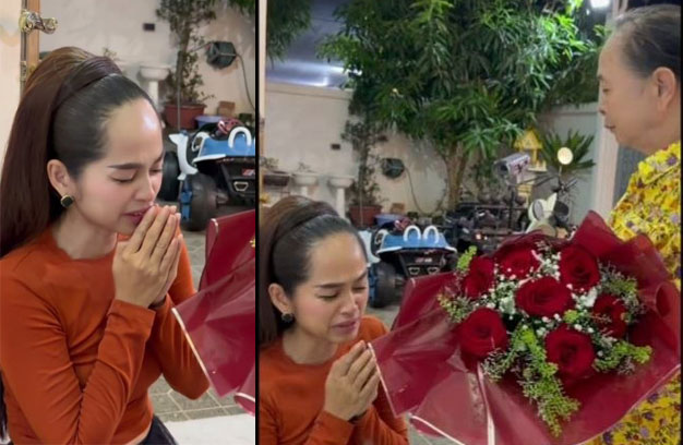 តាមរយៈវីដេអូនោះ គេឃើញលោកស្រី មាស ច័ន្ទដាលីន បានទិញផ្កា ១បាច់ធំ ជូនម្តាយ និងបានក្រាបសំពះម្តាយ រៀបរាប់ទាំងទឹកភ្នែកថា “ខ្ញុំសុំឱ្យម៉ែឯង ខមាលទោសឱ្យខ្ញុំ ហើយម៉ែឯងដឹងថា ខ្ញុំអត់និយាយរកម៉ែឯង ២ឆ្នាំហើយ ហើយម៉ែឯងដឹងហេតុផលម៉េច បានខ្ញុំអត់និយាយអត់? ម៉ែឯងទៅផ្ទះជីបម៉ុង ថ្ងៃដំបូង ម៉ែឯងឃើញខ្ញុំទឹកភ្នែក ខ្ញុំហៅម៉ែឯងទៅ នៅជាមួយខ្ញុំ ម៉េចម៉ែឯងវេចបង្វេចចេញពីផ្ទះចាស់ទៅ ខ្ញុំហៅម៉ែឯង យកខោអាវ យកអីទៅផ្ទះជីបម៉ុង ម៉ែឯងអត់ទៅទេ ម៉ែឯងឱ្យខ្ញុំយំ ថ្ងៃដំបូងដែលខ្ញុំចូលផ្ទះជីបម៉ុង ហើយម៉ែឯងដឹងខ្ញុំមានប្រផ្នូលថាអត់ល្អ ខ្ញុំខឹងម៉ែឯងថា ហេតុអីថ្ងៃខ្ញុំចូលនៅផ្ទះជីបម៉ុង ដំបូង ម៉េចម៉ែឯងធ្វើឱ្យខ្ញុំយំ? ម៉េចម៉ែឯងវេចបង្វេចចេញពីផ្ទះ? ខ្ញុំមានប្រផ្នូលថា អត់ល្អ ដល់ពេលហើយ ក្រោយមក មានរឿងហ៊ា (ប្តី) គេចូលទៅបាញ់គាត់ដល់ផ្ទះ ខ្ញុំខឹងម៉ែឯង ខ្ញុំខឹងម៉ែឯង ដល់រាល់ថ្ងៃ ខ្ញុំអត់និយាយ ខ្ញុំអត់អាចនិយាយរកម៉ែឯងបាន ហេតុផលហ្នឹងហើយដែលខ្ញុំអត់និយាយរកម៉ែឯង ហើយម៉ែឯងដឹងហើយថា រាល់ថ្ងៃ ខ្ញុំខុសជាមួយម៉ែឯង ហើយម៉ែឯង ដឹងហើយតើ ម៉ែឯងជំពាក់គេម៉ាន? ជាង១០លាន ខ្ញុំសងឡើងខ្ញុំវេទនា ប្តីខ្ញុំខំប្រឹងវេទនា ដោយសារប្រពន្ធជួយម្តាយ ហើយប៉ុន្មានថ្ងៃមុន បងប្អូនទាំងអស់គ្នា ដឹងហើយ ប៉ុន្មានថ្ងៃមុន ខ្ញុំបានចេញសែកទៅឱ្យគេ ១លាន គេបានប្តឹងខ្ញុំ ខ្ញុំអត់ដឹង គេបានឃាត់ខ្លួនខ្ញុំ គេទារលុយ ៥០ម៉ឺនភ្លាម ហើយពេលនោះ ខ្ញុំគិតថា ខ្ញុំលែងចង់រស់ ហើយ ព្រោះខ្ញុំឆ្អែតៗនឹងបញ្ហា តាំងពីថ្ងៃដំបូងដែលខ្ញុំរ៉ាប់រងជំនួសគាត់ រហូតដល់ថ្ងៃនេះ ខ្ញុំពិបាកៗមែនទែន ពិបាករហូតដល់ប្តីខ្ញុំចាកចេញទៅ នៅសល់ខ្ញុំតែម្នាក់ឯង…”។