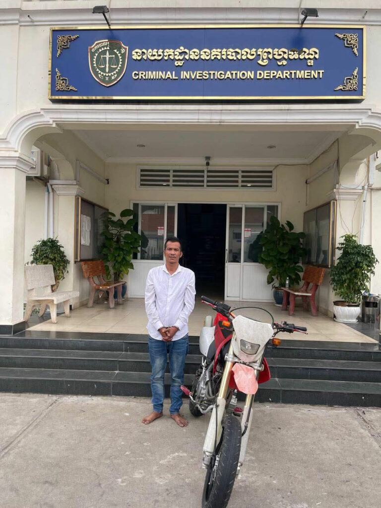 ជនសង្ស័យពាក់ព័ន្ធនឹងករណី លួចម៉ូតូ កាលពីថ្ងៃទី២៤ ខែមេសា ឆ្នាំ២០២៥ វេលាម៉ោង ០៣និង៥៥នាទីទៀបភ្លឺ នៅត្រង់ចំណុចមុខប៉ុស្តិ៍នគរបាលរដ្ឋបាលវត្តភ្នំ ផ្លូវលេខ១០៨ សង្កាត់វត្តភ្នំ ខណ្ឌដូនពេញ រាជធានីភ្នំពេញ។ជនសង្ស័យ មានឈ្មោះ ជុំ ផល្លា ហៅតឿ ភេទប្រុស អាយុ៤០ឆ្នាំ ជនជាតិខ្មែរ។ សម្ភារៈដកហូត រួមមាន ម៉ូតូ ០១គ្រឿង ម៉ាក Honda XR ពណ៌ស-ក្រហម ពាក់ស្លាកលេខ ភ្នំពេញ 1KB-3616 (បានប្រគល់ជូនជន រងគ្រោះ)។