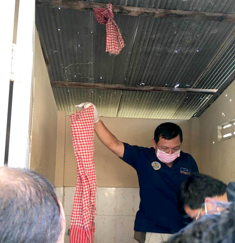 ក្រោយកើតហេតុ កម្លាំងការិយាល័យនគរបាលបច្ចេកទេសនិងវិទ្យាសាស្ត្រ បានចុះទៅពិនិត្យសពដល់ទីតាំងកើតហេតុ រួចបញ្ជាក់ថា ពិរុទ្ធជនរូបនេះ ពិតជាបានចងកសម្លាប់ខ្លួនប្រាកដមែន ដោយប្រើក្រមាពណ៌ក្រហម ក្រឡាការ៉ូពណ៌ស ចងកភ្ជាប់នឹងធ្នឹមបន្ទប់ទឹក បណ្តាលឱ្យស្លាប់។