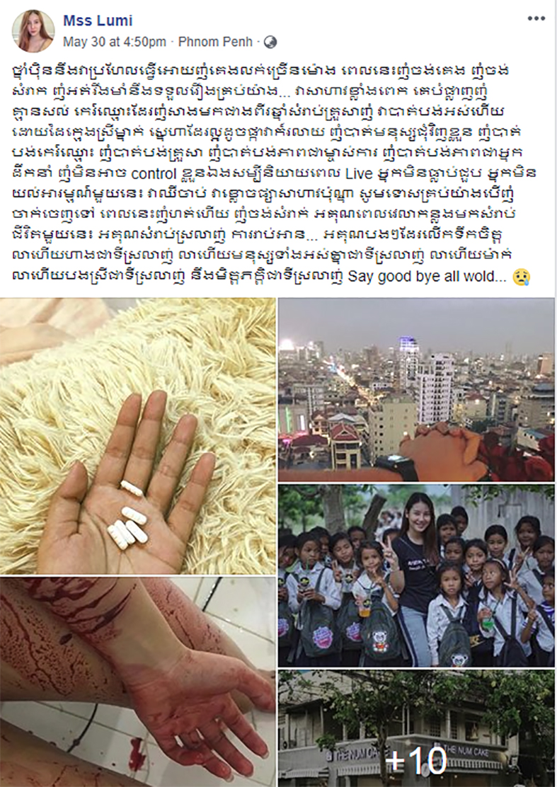 ដោយឡែក នៅថ្ងៃទី៣១ ខែឧសភា ឆ្នាំ២០១៨ បន្ទាប់ពីសម្រេចចិត្តអារដៃ និងលេបថ្នាំសម្លាប់ខ្លួន កញ្ញា Lumi បានបង្ហោះសារមួយថា “ប៉ុន្មានម៉ោងនេះ មានឆាតជាច្រើន… ឆាតមកលើកទឹកចិត្ត ឆាតមកឱ្យកំលាំងចិត្ត ឱ្យញុំក្រោកឈរឡើង យប់មិញចិត្តខ្ងុំធ្លាក់ចុះ ខ្ញុំបានលេបថ្នាំងងុយគេង៥គ្រាប់ ញុំក៏គេងលក់ ខ្ងុំស្មានតែញុំទៅហើយ តែការពិតខ្ងុំមិនទាន់ស្លាប់ទេ ពេលឃើញឆាតបងប្អូន គាត់និយាយរៀបរាប់ច្រើន ចឹងពេលនេះខ្ងុំនឹងរឹងមាំឱ្យដល់ទីបញ្ចប់ ខ្ងុំនឹងដាក់ពាក្យបណ្តឹងប្តឹងពីបទបរិហាកេរ្តិ៍ខ្ញុំថាយកប្តីគេ វាប៉ះពាល់ខ្លាំងសំរាប់កិត្តិយសខ្ញុំ សូមអ្នកទាំងអស់គ្នា ផ្តល់ជាកំលាំងចិត្តដល់ខ្ញុំផង ដែលជាជនរងគ្រោះ…”។