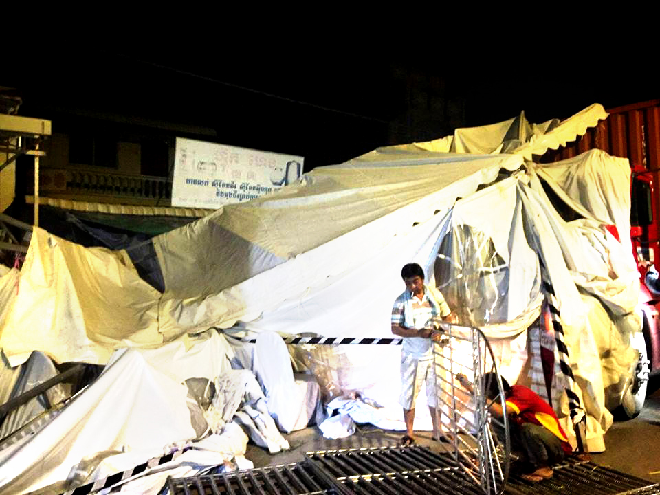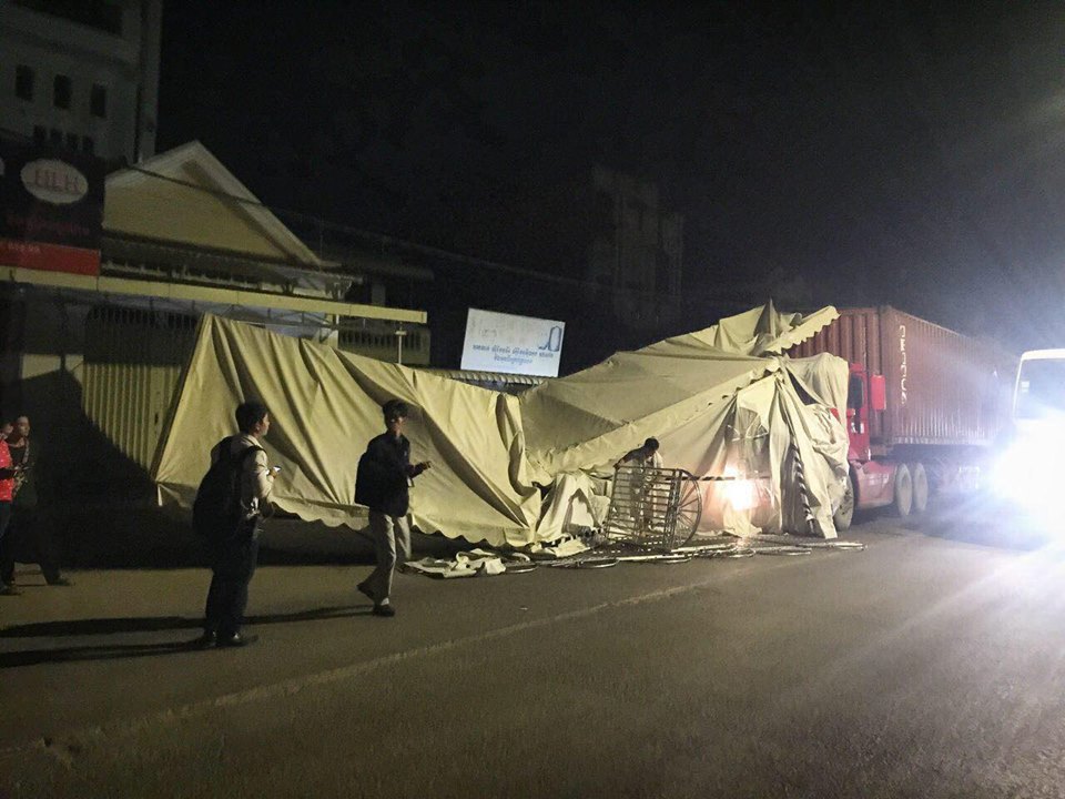 ភ្នំពេញ ៖ រថយន្តកុងតឺន័រដឹកស្រូវសាលី១គ្រឿង បើកបរដោយយុវជនម្នាក់ដោយគ្មានព្រូនៅក្បែរ ណាមួយស្ថិតក្នុងសភាពងោកងុយផង ក៏បណ្តាលឱ្យជ្រុលចង្កូតទៅបុកទម្លុះចូលរោងបុណ្យ៧ថ្ងៃ បណ្តាលឱ្យរងការខូចខាតយ៉ាងដំណំ តែសំណាងល្អមិនបង្កឱ្យមនុស្សសម្រាកនៅក្នុងរោងបុណ្យរងរបួសនោះទេ គ្រាន់តែបង្កឱ្យម្នាក់ៗភ័យប៉ះសក់ប៉ុណ្ណោះ។