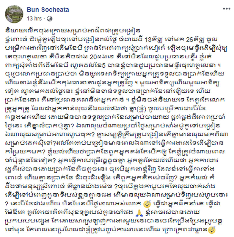 យោងតាមគណនីហ្វេសប៊ុកផ្ទាល់ខ្លួនរបស់អ្នកគ្រូបង្រៀនខាងលើ ដែលមានឈ្មោះ Bun Socheata បានបង្ហោះសារមួយ កាលពីថ្ងៃទី១៤ ខែមិថុនា ឆ្នាំ២០១៨ ថា “និយាយលើកចុងក្រោយ សម្រាប់អាជីពជាគ្រូបង្រៀន ខ្ញុំពោះធំ ជិះម៉ូតូឡើងចុះទៅបង្រៀនរាល់ថ្ងៃ ចំងាយដី១៣គីឡូ ទៅមក២៦គីឡូ ចូលបម្រើការងារវិញនៅដើមខែបី គ្រាន់តែរត់ពាក្យសុំប្រាក់បៀវត៍ ឡើងចុះមន្ទីរដើម្បីសុំឱ្យគេចុះហត្ថលេខា គឺមិនតិចជាង២០ដងទេ គឺទៅមិនដែលជួបប្រធានមន្ទីរ ខ្ញុំរត់ពាក្យសុំតាំងពីដើមខែបី រហូតដល់ខែ៥ បានខ្ញុំបានជួបប្រធានមន្ទីរចុះហត្ថលេខា។ ចុះរួចលោកប្រធានប្រាប់ថា មិនយូរទេអាទិត្យក្រោយអ្នកគ្រូទទួលបានប្រាក់ខែហើយ ហើយខាងខ្ញុំនឹងបើកកុងធានាគារជូនអ្នកគ្រូវិញ។ មួយអាទិត្យ ហើយមួយអាទិត្យទៀត រហូតមកដល់ថ្ងៃនេះ ខ្ញុំនៅមិនទាន់ទទួលបានប្រាក់ខែនៅឡើយទេ ហើយប្រាក់ខែនោះ គឺនៅប្រធានគណនីជាអ្នកកាន់។ ខ្ញុំមិនចង់និយាយទេ តែគួរតែលោកគ្រូអ្នកគ្រូ ដែលជាអ្នកកាន់លុយនឹងយល់ផងថា គ្នា (ខ្ញុំ) ចូលបម្រើការងារបីខែកន្លងមកហើយ ដោយមិនបានទទួលប្រាក់ខែសម្រាប់ចាយវាយ ផ្គត់ផ្គង់ជីវភាពប្រចាំថ្ងៃនេះ តើគ្នាលំបាកប៉ុនណា? ឯណាលុយចំណាយប្រចាំថ្ងៃសម្រាប់សាំងម៉ូតូទៅបង្រៀន ឯណាលុយសម្រាប់អាហារហូបចុក? គ្នាសម្បត្តិត្រឹមគ្រូបង្រៀន តើគ្នាមានលុយមកពីណាសម្រាប់ដេកស៊ីទៅ? រវល់តែជាប់បង្រៀន មានពេលឯណាទៅធ្វើការងារដទៃ ដើម្បីបានកម្រៃយកមក? ខ្ញុំយល់ហើយថា ប្រាក់ខែពួកអ្នកគង់តែបើកឱ្យ តែខ្ញុំត្រូវចំណាយពេលចាំប៉ុន្មានខែទៀត? អ្នកធ្វើការបម្រើរដ្ឋដូចគ្នា អ្នកគួរតែយល់ហើយថា អ្នកការងាររដ្ឋ គឺរស់បានដោយប្រាក់ខែតិចតួចនេះ ចុះបើអ្នកជាខ្ញុំវិញ ដែលខំទៅធ្វើការទាំងពោះធំ ហើយគ្មានប្រាក់ខែ ជិះចុះជិះឡើង តើពួកអ្នកគិតម៉េចវិញ? អ្នកក៏យល់ ក៏ដឹងថាមនុស្សស្រីពោះធំ គឺឃ្លានយ៉ាងម៉េច? ចុះបើក្នុងកាបូប រកតែលុយចាក់សាំងដើម្បីទៅបំពេញតួនាទីរបស់ខ្លួនគ្មានផង តើមានលុយឯណាសម្រាប់ទិញរបស់ហូបនោះ? នេះបីខែជាងហើយ មិនមែនបីថ្ងៃទេ ណាអស់លោកធ្វើជាអ្នកដឹកនាំគេ ធ្វើជាម៉ែឪគេ គួរតែចេះគិតពីសុខទុក្ខរបស់កូនចៅផង ខ្ញុំអាចរស់បានដោយប្រកបរបបផ្សេង តែដោយសារស្រឡាញ់ការងារមួយនេះ បានចេះតែប្រឹងប្រែងប្តូរបន្តទៅមុខ តែពេលនេះប្រហែលជាខ្ញុំត្រូវបញ្ចប់ការងារនេះហើយ ព្រោះក្រពះវាឃ្លាន…”។