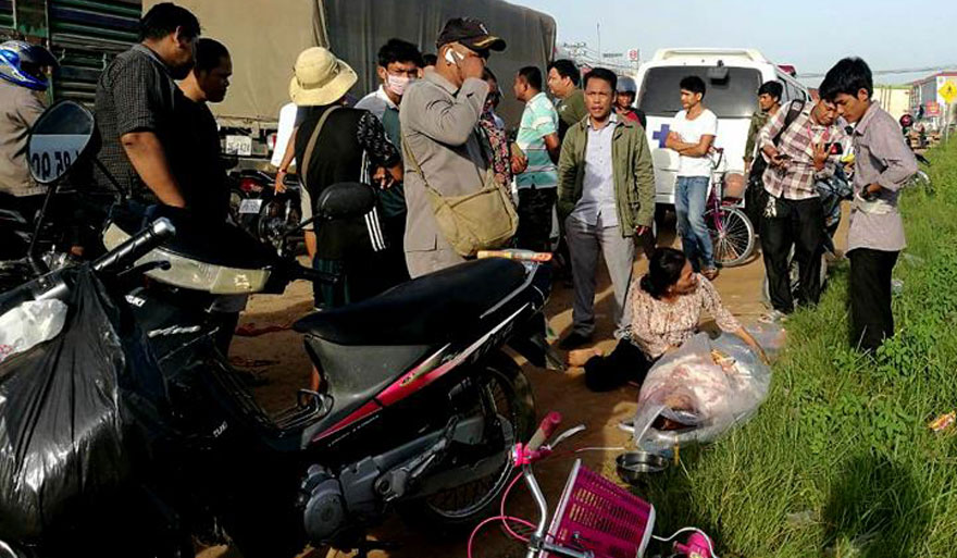 ភ្នំពេញ ៖ បុរសម្នាក់ បានបើកម៉ូតូដឹកប្រពន្ធ និងកូនប្រុសចេញពីផ្ទះជួល សំដៅជូនប្រពន្ធទៅធ្វើការ ស្រាប់តែអកុសល បើកដល់ពាក់កណ្តាលផ្លូវ ក៏ត្រូវរថយន្តដឹកទឹកកកមួយគ្រឿង បើកយ៉ាងលឿន ព្យាយាមវ៉ាជែងរថយន្តមួយគ្រឿងផ្សេងទៀត ពីខាងស្តាំដៃ ធ្វើឱ្យជ្រុលទៅបុកម៉ូតូជនរងគ្រោះយ៉ាងពេញទំហឹង បណ្តាលឱ្យស្ត្រីជាប្រពន្ធធ្លាក់ពីលើម៉ូតូស្លាប់យ៉ាងអាណោចអាធ័ម ចំណែកបុរសជាប្តី រួមនិងកូនតូច ទទួលរងរបួសធ្ងន់។