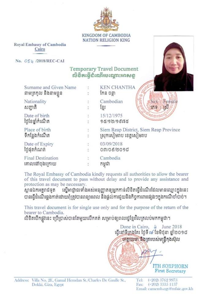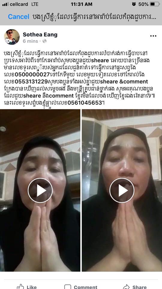 យោងតាមទំព័រហ្វេសប៊ុកផ្ទាល់របស់លោកអូស្មាន ហាស្សាន់ ដែលបានបង្ហោះនៅរសៀលថ្ងៃទី០៣ ខែកក្កដា ឆ្នាំ២០១៨ ភ្ជាប់ជាមួយនឹងរូបភាពរបស់ពលការិនីរងគ្រោះខាងលើ ដែលមានទឹកមុខរីករាយ ខណៈកំពុងនៅលើយន្តហោះធ្វើដំណើរពីទីក្រុងជុដះ ប្រទេស អារ៉ាប៊ី សាអូឌីត ឆ្ពោះមកកាន់ទីក្រុងបាងកក ដើម្បីបន្តដំណើរត្រឡប់មកកម្ពុជា ដែលនឹងមកដល់អាកាសយាន្តដ្ឋានអន្តរជាតិភ្នំពេញ នៅព្រឹកថ្ងៃទី៤ ខែកក្កដា ឆ្នាំ២០១៨។
