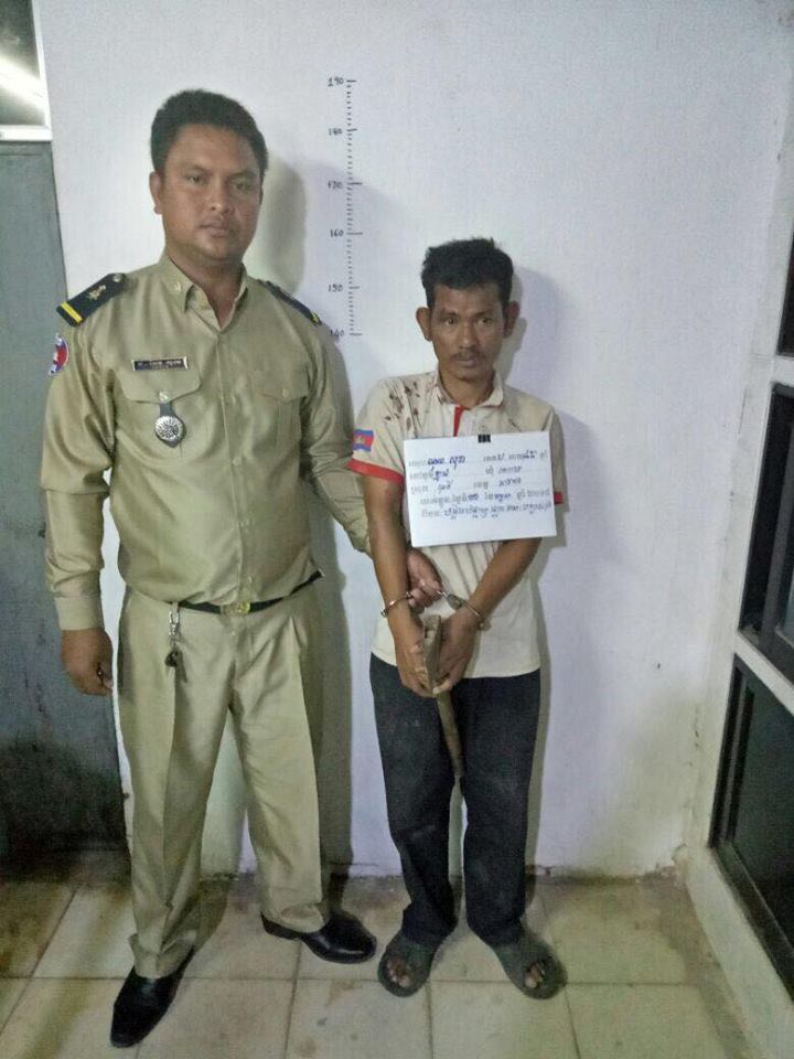 តាមប្រភពពីកន្លែងកើតហេតុ បានឱ្យដឹងថា នៅមុនពេលកើតហេតុ គេឃើញជនសង្ស័យខាងលើ បានកាន់ពូថៅដើរចេញពីផ្ទះ សំដៅទៅកាន់ទីតាំងកើតហេតុខាងលើ ដែលមានស្លាកគណបក្សប្រជាជនកម្ពុជា។ លុះទៅដល់ ជនសង្ស័យក៏បានទាញពូថៅកាប់ផ្តួលស្លាកគណបក្សនោះចោលតែម្តង បណ្តាលឱ្យបាក់រលំទៅលើដី រួចក៏ដើរត្រឡប់ទៅផ្ទះវិញបាត់។ បន្ទាប់មក សាក្សីដែលប្រទះឃើញហេតុការណ៍ បានរាយការណ៍ប្រាប់សមត្ថកិច្ច ចុះមកឃាត់ខ្លួនជនសង្ស័យនាំទៅសាកសួរភ្លាមៗតែម្តង។