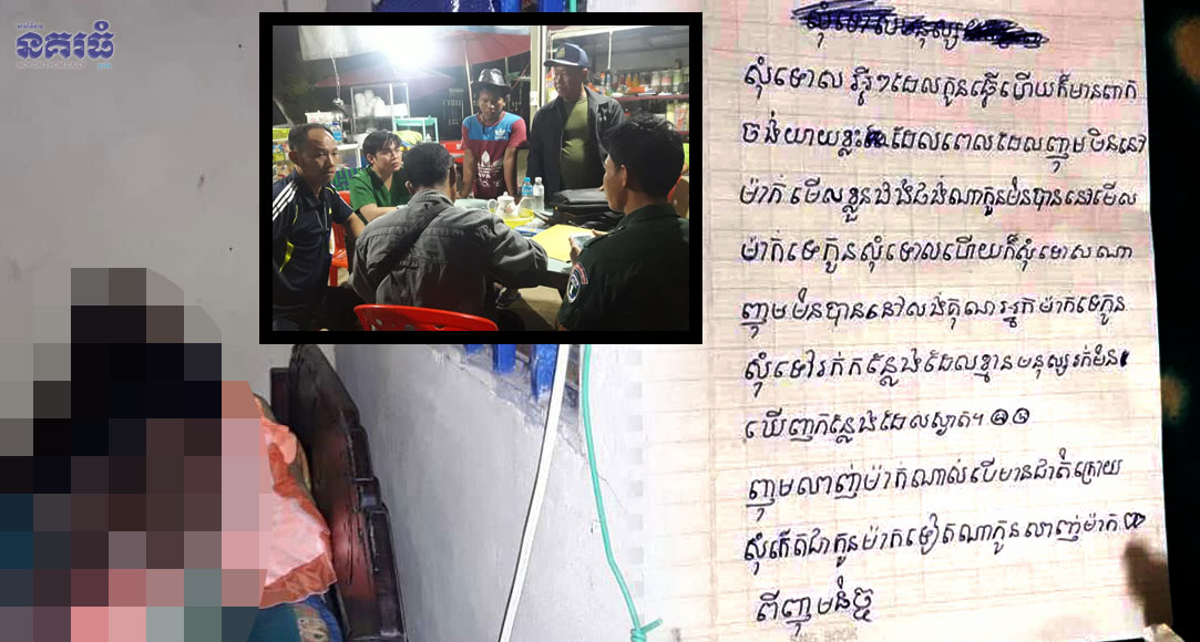 ខេត្តបន្ទាយមានជ័យ ៖ ហេតុការណ៍ដ៏ភ្ញាក់ផ្អើលមួយ បានកើតឡើងកាលពីវេលាម៉ោង៨ និង៣០នាទីយប់ ថ្ងៃទី២៩ ខែវិច្ឆិកា ឆ្នាំ២០១៨ មាននារីវ័យជំទង់ម្នាក់បានទូរស័ព្ទប្រាប់ម្តាយថា នាងបានស្រលាញ់គ្នា ជាមួយយុវជនម្នាក់ចង់សុំរៀបការជាមួយគ្នា លុះម្តាយសួរថា បង់ខ្លួនប្រាណឬនៅ? កូនស្រីក៏ឆ្លើយថា នៅទេ លុះម្តាយប្រាប់ថា នឹងនាំគ្រូពេទ្យ ទៅឆែកមើល មុននឹងផ្សំផ្គុំរៀបការឱ្យ ស្រាប់តែកូនស្រីភ័យខ្លួន ក៏គិតខ្លីចងកសម្លាប់ខ្លួន ដោយបន្សល់ទុកលិខិតបណ្តាំមួយច្បាប់សុំទោសម្តាយ នៅចំណុចបន្ទប់ជួលលេខ A-09 ម្តុំមាត់អូរផ្កាយ៥ ស្ថិតក្នុងភូមិក្បាលស្ពាន១ សង្កាត់ប៉ោយប៉ែត ក្រុងប៉ោយប៉ែត។