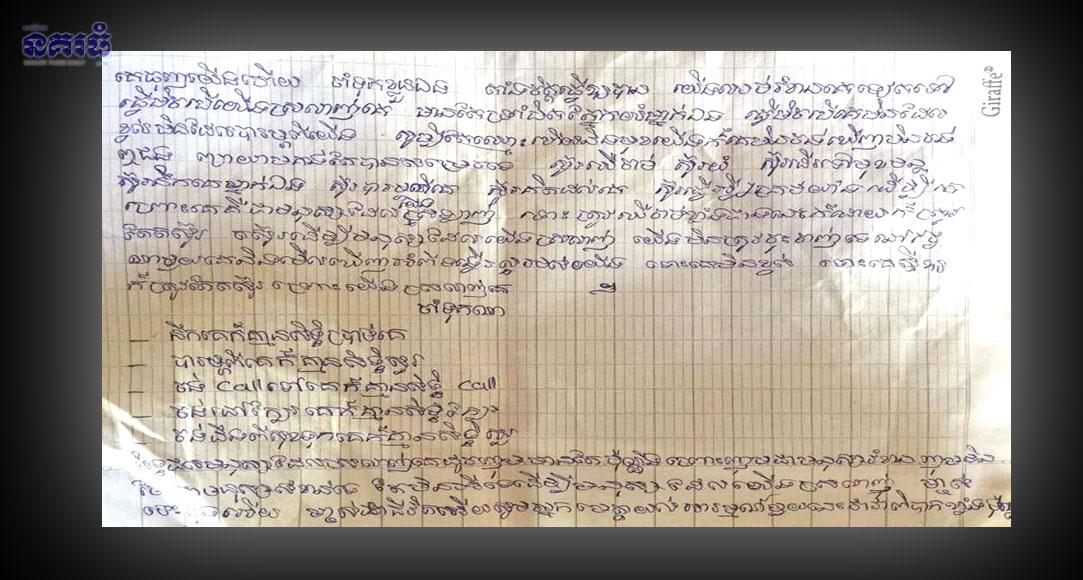 សៀមរាប ៖ សិស្សស្រីម្នាក់បានធ្វើអត្តឃាតចងកសម្លាប់ខ្លួននៅលើផ្ទះរបស់ខ្លួន ដោយបន្សល់ទុកនូវលិខិតមួយច្បាប់ ដែលបញ្ជាក់ថា នាងខូចចិត្តដោយសារស្នេហា ទើបគិតខ្លីសម្រេចគិតខ្លីបែបនេះ។