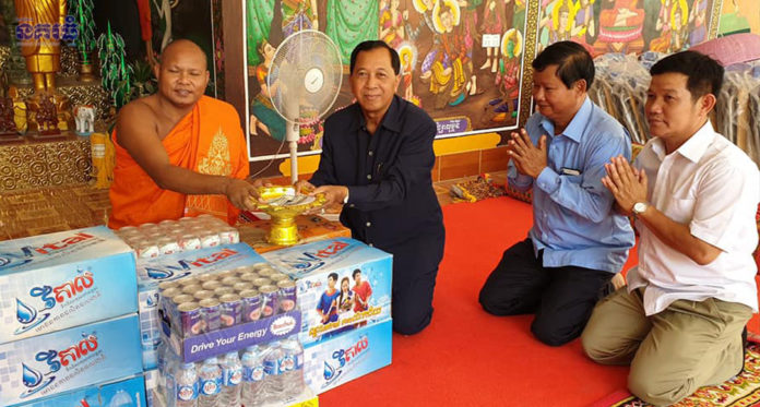នាព្រឹកថ្ងៃសៅរ៍ ទី០៥ ខែមករា ឆ្នាំ២០១៩ ឯកឧត្តមសួស គង់ រដ្ឋលេខាធិការប្រចាំការក្រសួងអភិវឌ្ឍជនបទ បាននាំបច្ច័យថ្នាក់ដឹកនាំក្រុមការងារចុះជួយស្រុកភ្នំស្រួច ប្រគេនដល់ព្រះចៅអធិការវត្តត្រពាំងក្រឡឹង អ៊ុង ជី ដែលស្ថិតនៅឃុំតាំងស្យា ស្រុកភ្នំស្រួច ខេត្តកំពង់ស្ពឺ ដើម្បីប្រើប្រាស់សម្រាប់ចូលរួមផ្គត់ផ្គង់ដល់ព្រះសង្ឃ ចំនួន៣០០អង្គ ដែលនិមន្តពីគ្រប់ឃុំទូទាំងស្រុកភ្នំស្រួច មកប្រឡងធម្មវិន័យ។