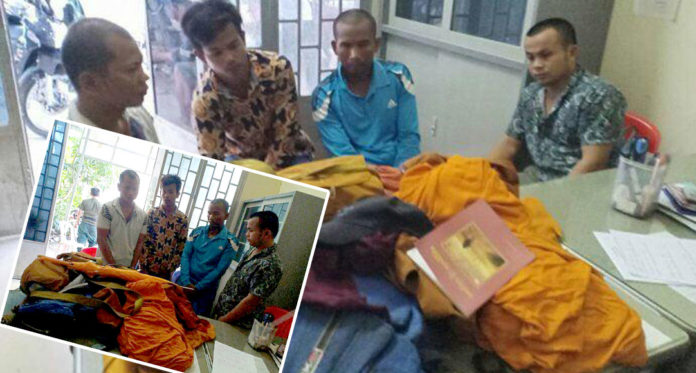 តាមប្រភពពីអាជ្ញាធរមូលដ្ឋាន បានឱ្យដឹងថា នៅមុនកើតហេតុ ខណៈដែលកម្លាំងសមត្ថកិច្ចកំពុងជិះម៉ូតូដើរល្បាតមើលក្នុងមូលដ្ឋាន ដល់គោលដៅខាងលើ ស្រាប់តែឃើញរ៉ឺម៉កម៉ូតូកង់បីខាងលើ មានអ្នកជិះ៣នាក់ ដោយកោរសក់ខុសប្រក្រតី ក៏ឃាត់ឆែកឆេរ ស្រាប់តែឃើញសម្ភារសង្ឃក្លែងបន្លំស្បង់ចីវរ ទើបសម្រេច ឃាត់ជាក់ស្តែងតែម្តង រួចក៏នាំយកមកធ្វើការសាកសួរនៅប៉ុស្តិ៍។