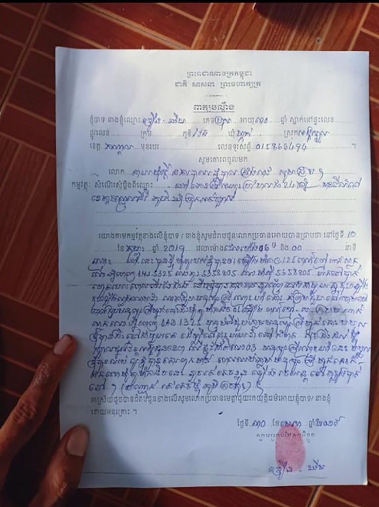 ពាក្យបណ្តឹងខាងលើបន្តថា “កាលពីថ្ងៃទី១០ ខែកុម្ភៈ ឆ្នាំ២០១៩ វេលាម៉ោង៦ព្រឹក មុនពេលកើតហេតុ ខ្ញុំនិងឈ្មោះយ៉ា ជាសង្សារនឹងគ្នា រយៈពេល៦ខែមកហើយ ហើយបាននាំគ្នាមកជួលបន្ទប់ភូមិស្លែងរលើង សង្កាត់អូរបែកក្អម ខណ្ឌសែនសុខ រស់នៅជាមួយគ្នាដូចប្តីប្រពន្ធ ស្រាប់តែថ្ងៃទី១០ ខែ០២ ឆ្នាំ២០១៩ ឈ្មោះយ៉ា បានខ្ចីម៉ូតូរបស់ខ្ញុំ ហើយតាំងពីថ្ងៃនោះមក ទូរស័ព្ទ និងហ្វេសប៊ុក បិទរហូត មិនអាចទាក់ទងបានរហូត…”។