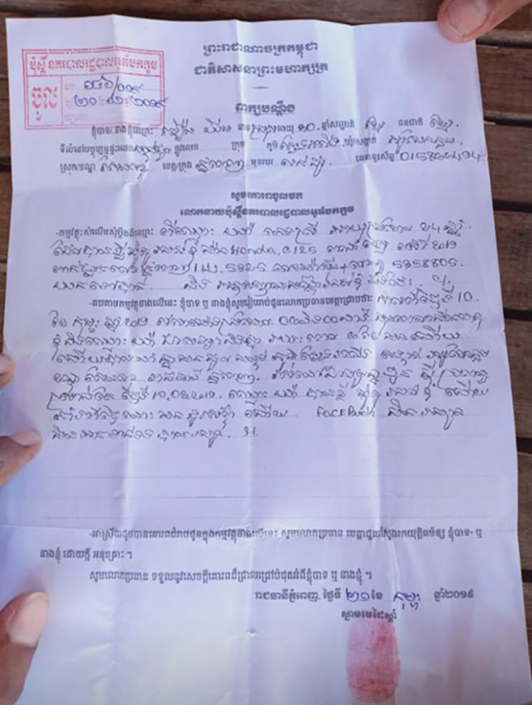 យោងតាមពាក្យបណ្តឹងរបស់បុរសជាម្ចាស់ម៉ូតូ ដែលបានប្តឹងសមត្ថកិច្ចតាំងពីថ្ងៃទី១០ ខែកុម្ភៈ ឆ្នាំ២០១៩ កន្លងទៅ និងត្រូវបានបុរសជាម្ចាស់ម៉ូតូបង្ហោះក្នុងគណនីហ្វេសប៊ុករបស់ខ្លួន មានខ្លឹមសារថា “សុំប្តឹងពីឈ្មោះយ៉ា ភេទស្រី អាយុ២៤ឆ្នាំ ដែលបានខ្ចីម៉ូតូរបស់ខ្ញុំ ម៉ាកហុងដាឌ្រីម សេ១២៥ ពណ៌ខ្មៅ ស៊េរីឆ្នាំ២០១៩ ពាក់ស្លាកលេខ 1HJ-5325 យកទៅបាត់ និងអត្តសញ្ញាណប័ណ្ណរបស់ខ្ញុំផងដែរ”។