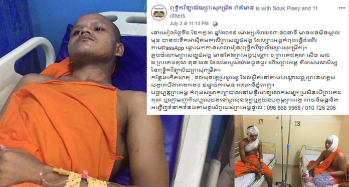 ភ្នំពេញ ៖ ព្រះសង្ឃ៤អង្គ កំពុងនិមន្តតាមម៉ូតូកង់បី សំដៅទៅសាលារៀន ក៏ស្រាប់តែធ្វើដំណើរដល់ពាក់កណ្តាលផ្លូវ ក៏ត្រូវជនមិនស្គាល់មុខចំនួន២នាក់ ជិះម៉ូតូ១គ្រឿង បង្អង់ល្បឿនមកអែបក្បែរ រួចជះទឹកអាស៊ីដមកលើព្រះសង្ឃទាំង៤អង្គ បណ្តាលឱ្យរងរបួសធ្ងន់ចំនួន២អង្គ បន្ទាប់មកក្រុមជនសង្ស័យក៏ជិះម៉ូតូគេចខ្លួនបាត់ដោយសុវត្ថិភាព។