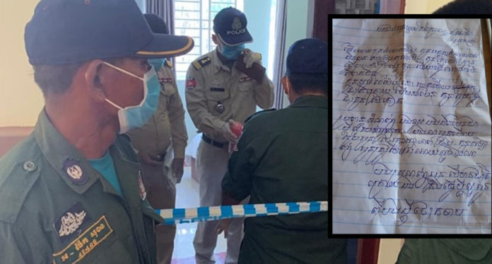 សមត្ថកិច្ចបានបន្ថែមថា នៅក្នុងបន្ទប់ដែលជនរងគ្រោះស្លាប់ សមត្ថកិច្ចក៏បានរកឃើញលិខិតមួយច្បាប់ ដែលជនរងគ្រោះបានបន្សល់ទុក ដែលមានអត្ថន័យថា “មកដល់អ្នកម្តាយ និងប្រពន្ធ កូនជាទីស្រលាញ់ ម៉ែឲ្យកូនសុំទោសផង កូនអកតញ្ញូណាស់ មិនទាន់តបស្នង កូនកែមិនបាន ធ្វើបាបទាមងប្រពន្ធកូន ហើយធ្វើឲ្យម៉ែពិបាកចិត្ត កូនសូមលាម៉ែថ្ងៃនេះរហូតហើយ ជាតិក្រោយ បើមានមែន កូនសូមធ្វើជាកូនម៉ែម្តងទៀត។