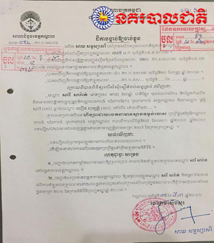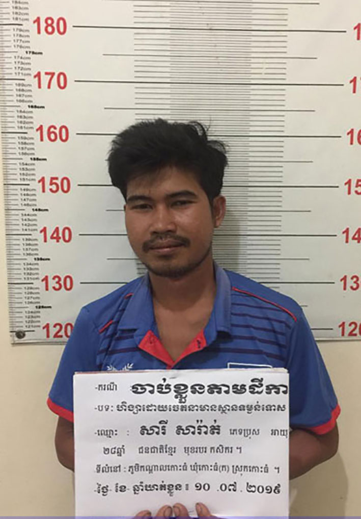 មន្ត្រីនគរបាលស្រុកកោះធំ បានឱ្យដឹងថា ជនត្រូវចោទដែលត្រូវបានសមត្ថកិច្ចចាប់ខ្លួន មានឈ្មោះសារី សារ៉ាត់ ភេទប្រុស អាយុ២៨ឆ្នាំ មានលំនៅភូមិកណ្តាលកោះធំ ឃុំកោះធំ (ក) ស្រុកកោះធំ។ ជននេះមានដីកាបង្គាប់ឱ្យចាប់ខ្លួនលេខ០៨៦ ចុះថ្ងៃទី០៩ ខែមីនា ឆ្នាំ ២០១៦ ចុះហត្ថលេខាដោយលោកសាយ សម្ផស្សសេរី ចៅក្រមស៊ើបសួរនៃសាលាដំបូងខេត្តកណ្តាល ដោយចោទប្រកាន់ពីបទហិង្សាដោយចេតនាមានស្ថានទម្ងន់ទោស ដែលប្រព្រឹត្តកាលពីថ្ងៃទី២៨ ខែមេសា ឆ្នាំ២០១១ ស្ថិតក្នុងភូមិ កណ្តាលកោះធំ ឃុំកោះធំ(ក) ស្រុកកោះធំ។