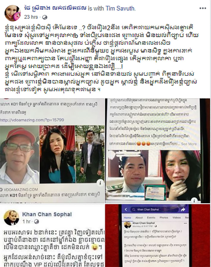 នាងថៃ ស្រីនាង អាយុ៣៨ឆ្នាំ បានសរសេរក្នុងគណនីហ្វេសប៊ុករបស់នាង នៅថ្ងៃទី១១ ខែកក្កដា ឆ្នាំ២០១៩ ថា “ខ្ញុំខុស ត្រង់ខ្ញុំសិចស៊ី តើមែនទេ…? ចឹងរឿង២ហ្នឹង គេពិតជាយកមកស៊ីសងគ្នាតើមែនទេ សុំសួរទៅអ្នកតុលាការ fb ទាំងបីរូបនេះផង ព្រោះល្ងង់មិនយល់ពីច្បាប់ ហើយពាក្យដែលលោកខ័ណ្ឌ ច័ន្ទសុផល បំផ្លើសថា ខ្ញុំផ្តល់ព័ត៌មានលេងសើច អ្នកឯងយកអីមកសំអាងក្នុងករណីនីមួយៗ អ្នករងរបួស មានសិទ្ធិក្នុងការដាក់ពាក្យ ឬដកពាក្យបាន តែបណ្តឹងអាជ្ញា គឺជារឿងផ្សេង តើអ្នកជាតុលាការ ឬជាអ្នកតែស្ករ ឱ្យប្រាកដ ដើម្បីឱ្យខ្លួនឯងល្បី…! ខ្ញុំមើលទៅសមត្ថភាពការងាររបស់អ្នកនៅមិនទាន់យល់ សូមបញ្ជាក់ពីតួនាទីរបស់អ្នកផង ព្រោះខ្ញុំមិនបានស្គាល់អ្នកច្បាស់ ដូចអ្នកស្គាល់ខ្ញុំ និងអ្នកដឹងរឿងខ្ញុំច្បាស់ជាងខ្ញុំទៅទៀត សូមអរគុណទុកជាមុន”។